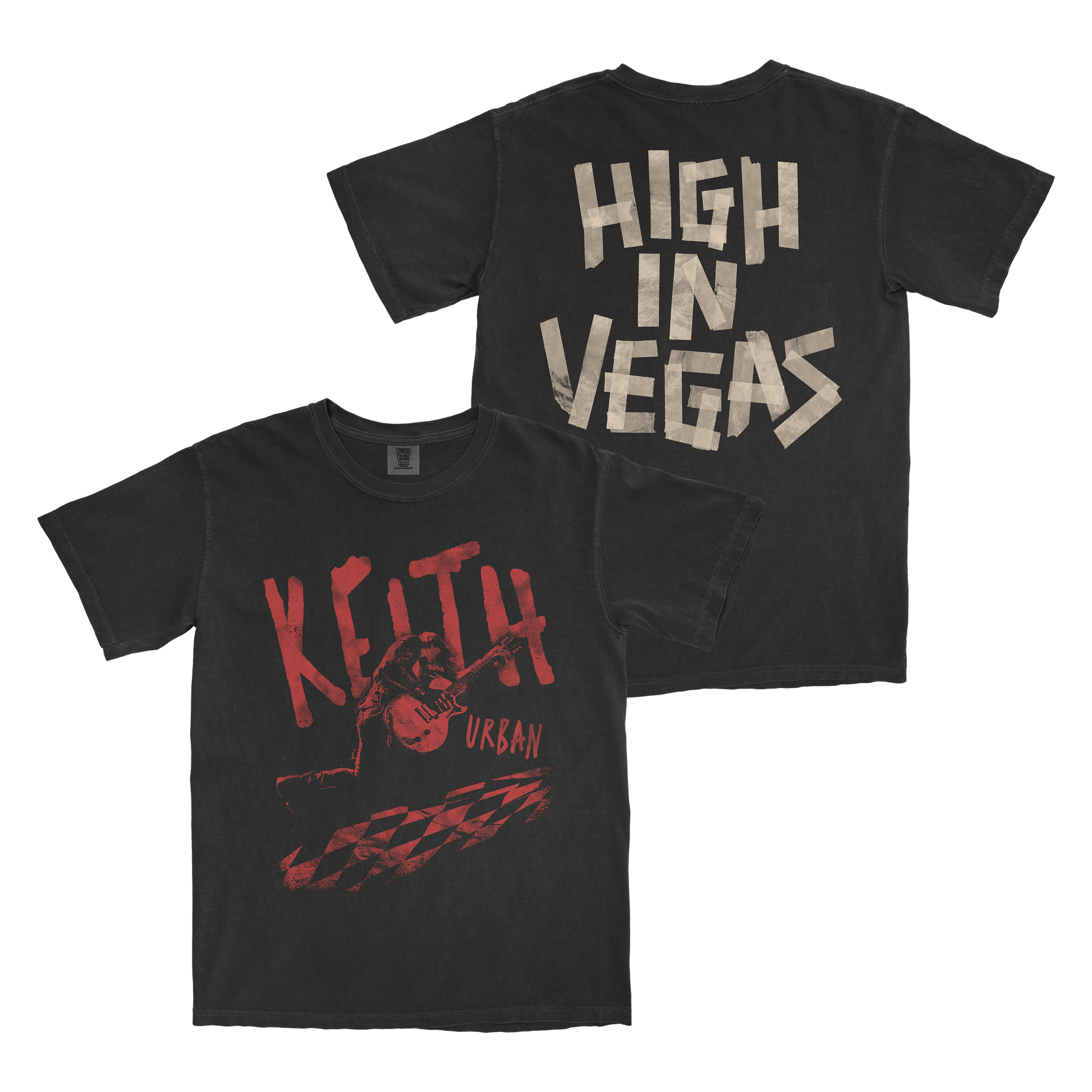 Features "KEITH URBAN" and a live performance image on the front and a DIY masking tape design of "HIGH IN VEGAS" on the back.
