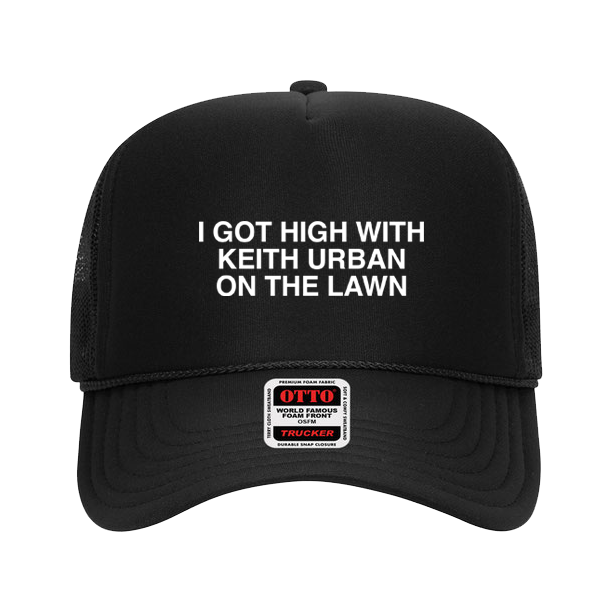 - Black foam trucker hat featuring "I GOT HIGH WITH KEITH URBAN ON THE LAWN" on the front